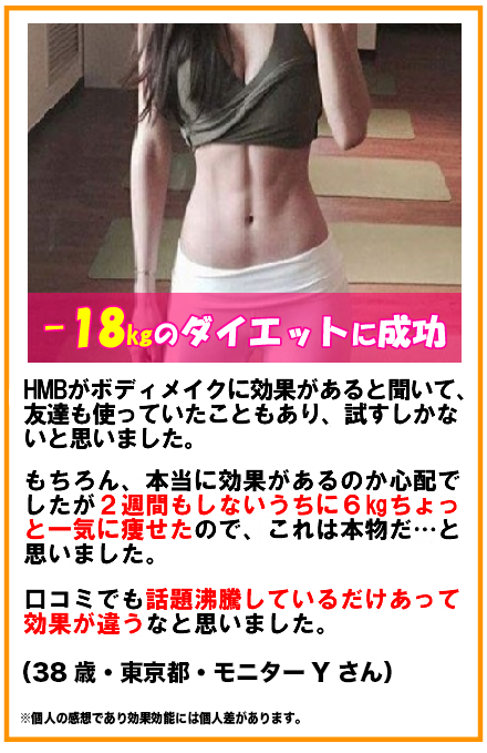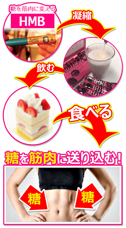 つまり、「HMB」とは食事で摂った脂肪を爆発的に燃焼し、基礎代謝を高めて食事制限も運動もせずに痩せていくというダイエット法。