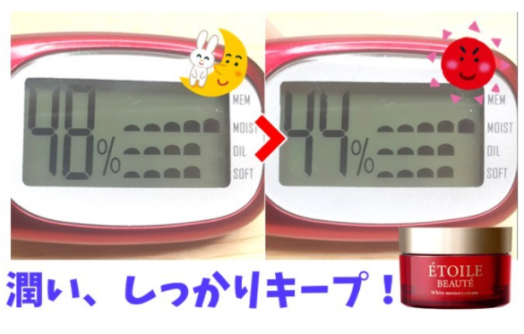 寝る前と次の日の朝に、エトワールボーテを塗ったお肌の潤い値を調べてみたら…