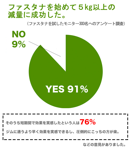 ↑こちらを見て下さい。ファスタナを飲み始めて1ヶ月以内に5kg以上の減量に成功した人が実に9割にものぼるんですよ!これは、売れる理由も納得ですよね。。