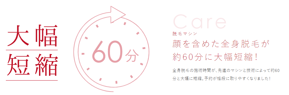 銀座カラーと他のサロンとの大きな違いは、一回で全身の施術ができ、しかも一回の施術時間は約60分なんです!