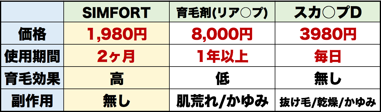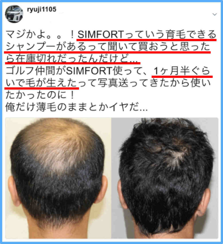 学生の時から「ハゲ眼鏡」とバカにされ続けてきました…育毛剤を使っても効果が無くて、遺伝だからと諦めてたけど、SIMFORTをオススメされたので2ヶ月使ってみました。自分でも信じられなかったけど、周りから毛が増えてる!と言われて実感しました!嬉しすぎて薄毛に悩んでる人にオススメしてます!