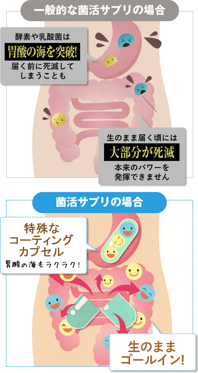 一般的なサプリだと腸に届く前に乳酸菌が死滅してしまうのですが、