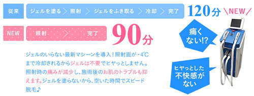 この最新式脱毛マシンならば、冷却ジェルが不要になっったため、ヒヤッとすることがなく、カラダも冷えることがなくなりました。