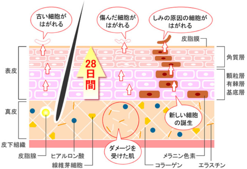 こちらの役割によって新しい肌細胞が生まれ、古い角質が剥がれることで美肌の状態を保つことが出来るんだとか。