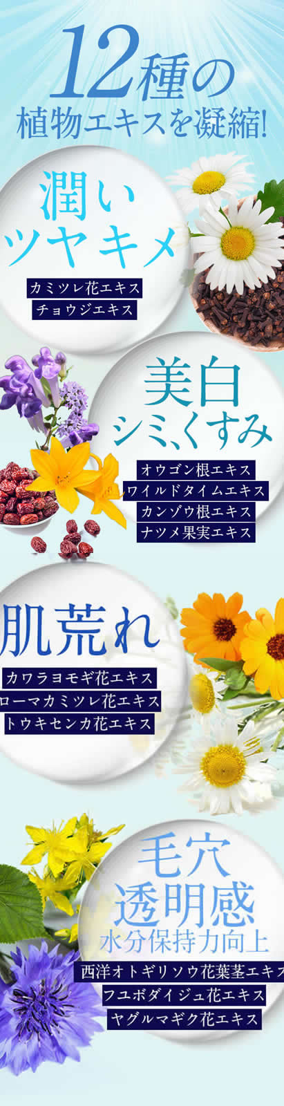 7種の高保湿美容成分や12種の植物エキスなど、乾燥肌やトラブル肌にも優しい成分になっています。
