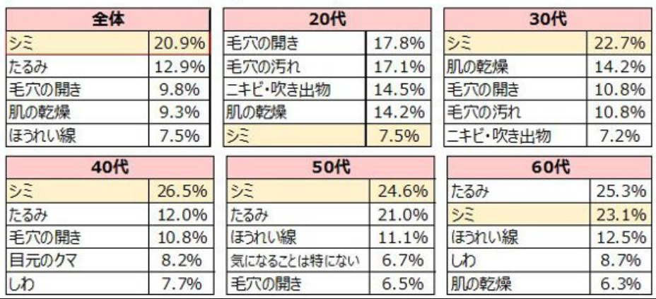 雑誌のアンケートでもほとんどの年代で第1位はシミ悩みでした。。