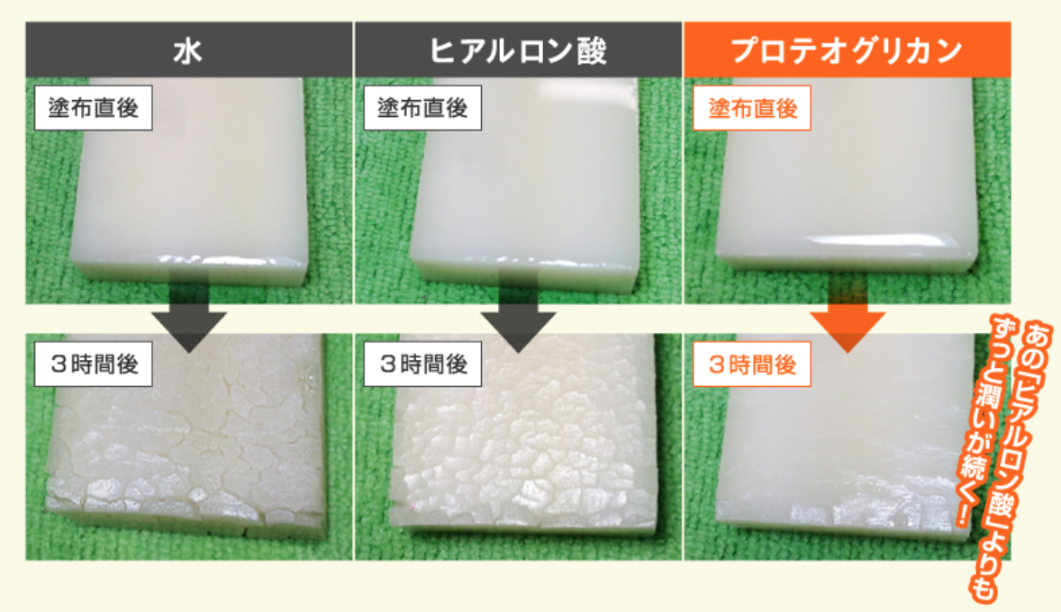 ご覧の通りプロテオグリカンが最も保水効果があるんです!