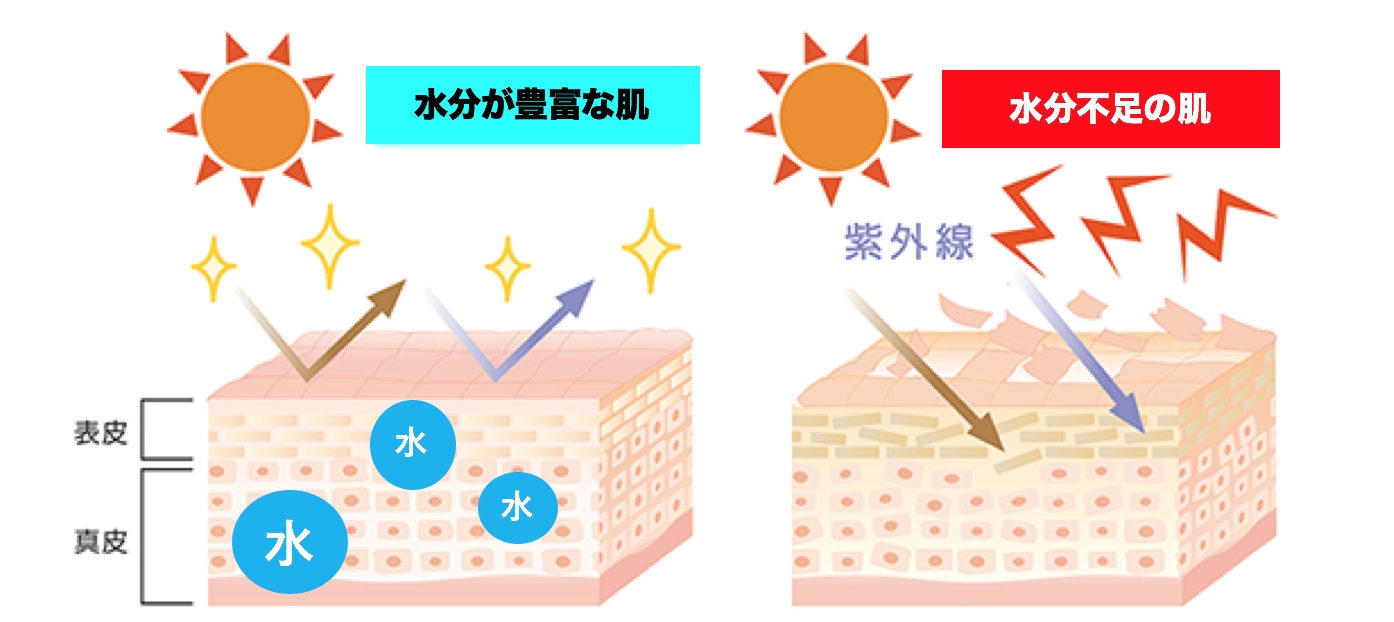 健康な肌には水分が豊富なので外部からの刺激に強いですが、水分がない肌は外部からの刺激に耐えることができません。