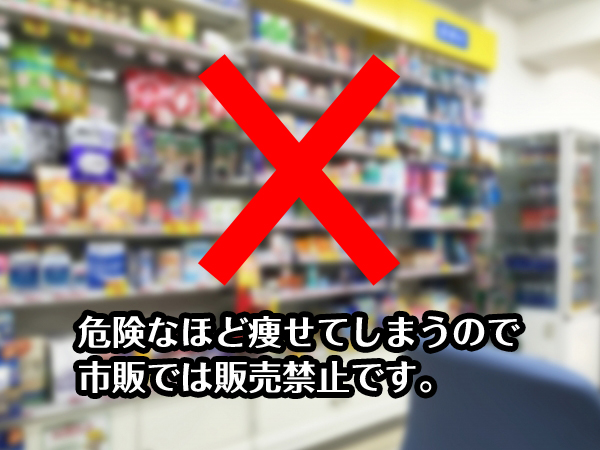 しかし、効果があまりにも高く「極端な減量」により健康を害してしまったという報告もあり、店頭での販売が禁止となってしまいました。