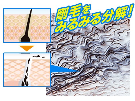Zリムーバーに含まれている「チオグリコール酸カルシウム」という分解成分が、体毛の組織をバラバラに分解し、どんな剛毛も根こそぎ除毛してくれるのです。